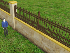 Stone wall with metal fence above for a British and American (B&A) style cemetery. 3m high. It is a 6.59m long spline.