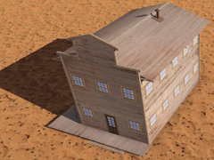 Two-story high wooden house, in the old west style, with a side staircase leading to the second floor. Building similar to version 9 but without a balcony facing the street. With chimney and smoke, it does not have night mode. Dimensions: 6m x 10m. Version 13F21. In this version the wood textures are gray