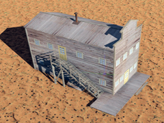Two-story high wooden house, in the old west style, with a side staircase leading to the second floor. Building similar to version 10 but without a balcony facing the street. With chimney and smoke, it does not have night mode. Dimensions: 6m x 12m. Version 14A1. In this version the wood textures are gray