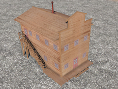 Two-story high wooden house, in the old west style, with a side staircase leading to the second floor. Building similar to version 9 but without a balcony facing the street. With chimney and smoke, it does not have night mode. Dimensions: 6m x 10m. Version 13A2. In this version the wood textures are reddish-brown