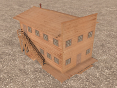 Two-story high wooden house, in the old west style, with a side staircase leading to the second floor. Building similar to version 9 but without a balcony facing the street. With chimney and smoke, it does not have night mode. Dimensions: 6m x 10m. Version 13D2. In this version the wood textures are reddish-brown