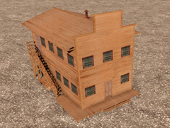 Two-story high wooden house, in the old west style, with a side staircase leading to the second floor. Building similar to version 9 but without a balcony facing the street. With chimney and smoke, it does not have night mode. Dimensions: 6m x 10m. Version 13H2. In this version the wood textures are reddish-brown