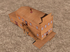 Two-story high wooden house, in the old west style, with a side staircase leading to the second floor. Building similar to version 10 but without a balcony facing the street. With chimney and smoke, it does not have night mode. Dimensions: 6m x 12m. Version 14F22. In this version the wood textures are reddish-brown