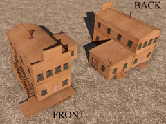 Two-story high wooden house, in the old west style, with a side staircase leading to the second floor. Building similar to version 10 but without a balcony facing the street. With chimney and smoke, it does not have night mode. Dimensions: 6m x 12m. Version 14H22. In this version the wood textures are reddish-brown