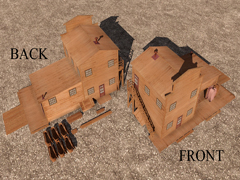Two-story high wooden house, in the style of the old west, with a side staircase to access the second floor and an attached warehouse. With chimney and smoke, it does not have night mode. Building dimensions: 6m x 7m, and the warehouse 6m x 6m. Version 15A2. Building used as a funeral home, without exterior advertising signs. With coffins on display and lumber for construction. In this version the wood textures are reddish-brown
