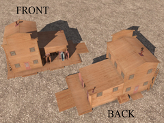 Two-story high wooden house, in the style of the old west, with a side staircase to access the second floor and an attached warehouse. With chimney and smoke, it does not have night mode. Building dimensions: 6m x 7m, and the warehouse 6m x 6m. Version 15B2. Building used as a funeral home, without exterior advertising signs. With some coffins on display in a simple version. In this version the wood textures are reddish-brown