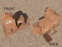 Two-story high wooden house, in the style of the old west, with a side staircase to access the second floor and an attached warehouse. With chimney and smoke, it does not have night mode. Building dimensions: 6m x 7m, and the warehouse 6m x 6m. Version 15C2. Building used as a funeral home under the name of Alan Benson, (Fictitious name). With coffins on display and lumber for construction. In this version the wood textures are reddish-brown