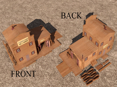 Two-story high wooden house, in the style of the old west, with a side staircase to access the second floor and an attached warehouse. With chimney and smoke, it does not have night mode. Building dimensions: 6m x 7m, and the warehouse 6m x 6m. Version 15D2. Building used as a funeral home under the name of Ben J. Jhonson, (Fictitious name). With coffins on display and lumber for construction. In this version the wood textures are reddish-brown