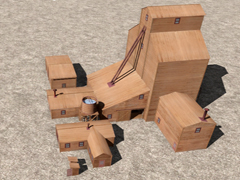 Grain loading and unloading facility or complex, made of wood, with grain elevator with open entrance doors, warehouse, office, water tower and outside toilets, old west style. Dimensions: 24m high, 41m wide and 30m long. It has 3 chimneys with smoke. It is not interactive or functional, it has no night mode. Version 2.. In this version the wood textures are reddish-brown
