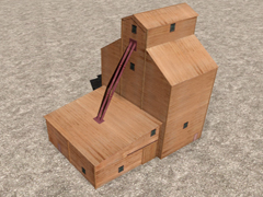 Grain loading, made of wood, with grain elevator with closed entrance doors, old west style. Dimensions: 24m high, 17m wide and 23m long. It is not interactive or functional, it has no night mode. Version C22. In this version the wood textures are reddish-brown