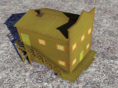 Two-story high wooden house, in the old west style, with a side staircase leading to the second floor. Building similar to version 8 but without a balcony facing the street. With chimney and smoke, it does not have night mode. Dimensions: 6m x 7m. Version 12B3. In this version the wood textures are yellow-grayish