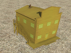 Two-story high wooden house, in the old west style, with a side staircase leading to the second floor. Building similar to version 8 but without a balcony facing the street. With chimney and smoke, it does not have night mode. Dimensions: 6m x 7m. Version 12G3. In this version the wood textures are yellow-grayish