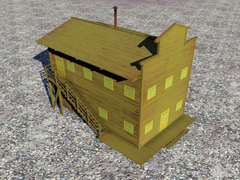 Two-story high wooden house, in the old west style, with a side staircase leading to the second floor. Building similar to version 9 but without a balcony facing the street. With chimney and smoke, it does not have night mode. Dimensions: 6m x 10m. Version 13A3. In this version the wood textures are yellow-grayish