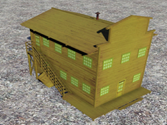 Two-story high wooden house, in the old west style, with a side staircase leading to the second floor. Building similar to version 9 but without a balcony facing the street. With chimney and smoke, it does not have night mode. Dimensions: 6m x 10m. Version 13G3. In this version the wood textures are yellow-grayish