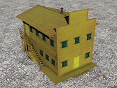 Two-story high wooden house, in the old west style, with a side staircase leading to the second floor. Building similar to version 9 but without a balcony facing the street. With chimney and smoke, it does not have night mode. Dimensions: 6m x 10m. Version 13H3. In this version the wood textures are yellow-grayish