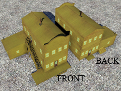 Two-story high wooden house, in the old west style, with a side staircase leading to the second floor. Building similar to version 10 but without a balcony facing the street. With chimney and smoke, it does not have night mode. Dimensions: 6m x 12m. Version 14F33. In this version the wood textures are yellow-grayish