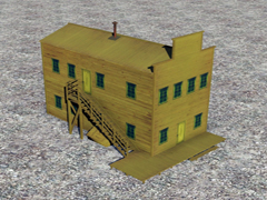 Two-story high wooden house, in the old west style, with a side staircase leading to the second floor. Building similar to version 10 but without a balcony facing the street. With chimney and smoke, it does not have night mode. Dimensions: 6m x 12m. Version 14H13. In this version the wood textures are yellow-grayish