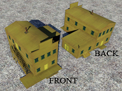 Two-story high wooden house, in the old west style, with a side staircase leading to the second floor. Building similar to version 10 but without a balcony facing the street. With chimney and smoke, it does not have night mode. Dimensions: 6m x 12m. Version 14H23. In this version the wood textures are yellow-grayish