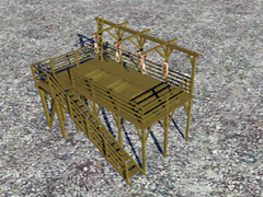 Wooden gallows scaffold for three simultaneous gallows, elevated 3.5m above the ground. Version 3. In this version the wood textures are yellow-grayish