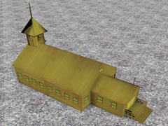 Wooden church and school, in the style of the old west, with bell tower, it has no night mode. Dimensions: 10m x 14m + 5m x5,5m. Version 11C3. In this version the wood textures are yellow-grayish