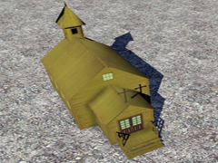 Wooden church and school, in the style of the old west, with bell tower, it has no night mode. Dimensions: 6m x 8m + 3m x3,5m. Version 11E3. In this version the wood textures are yellow-grayish