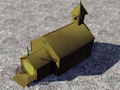 Wooden church and school, in the style of the old west, with bell tower, it has no night mode. Dimensions: 6m x 8m + 3m x3,5m. Version 11H3. In this version the wood textures are yellow-grayish