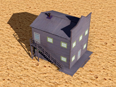 Two-story high wooden house, in the old west style, with a side staircase leading to the second floor. Building similar to version 8 but without a balcony facing the street. With chimney and smoke, it does not have night mode. Dimensions: 6m x 7m. Version 12B4. In this version the wood textures are blue-gray
