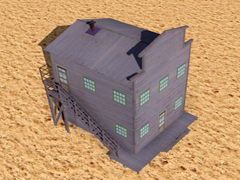 Two-story high wooden house, in the old west style, with a side staircase leading to the second floor. Building similar to version 8 but without a balcony facing the street. With chimney and smoke, it does not have night mode. Dimensions: 6m x 7m. Version 12G4. In this version the wood textures are blue-gray