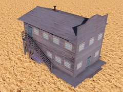 Two-story high wooden house, in the old west style, with a side staircase leading to the second floor. Building similar to version 9 but without a balcony facing the street. With chimney and smoke, it does not have night mode. Dimensions: 6m x 10m. Version 13E4. In this version the wood textures are blue-gray