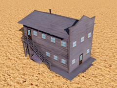 Two-story high wooden house, in the old west style, with a side staircase leading to the second floor. Building similar to version 9 but without a balcony facing the street. With chimney and smoke, it does not have night mode. Dimensions: 6m x 10m. Version 13F14. In this version the wood textures are blue-gray