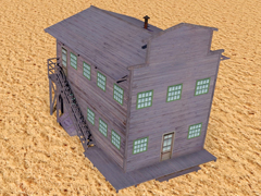 Two-story high wooden house, in the old west style, with a side staircase leading to the second floor. Building similar to version 9 but without a balcony facing the street. With chimney and smoke, it does not have night mode. Dimensions: 6m x 10m. Version 13G4. In this version the wood textures are blue-gray