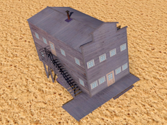Two-story high wooden house, in the old west style, with a side staircase leading to the second floor. Building similar to version 10 but without a balcony facing the street. With chimney and smoke, it does not have night mode. Dimensions: 6m x 12m. Version 14A4. In this version the wood textures are blue-gray