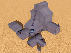 Grain loading and unloading facility or complex, made of wood, with grain elevator with open entrance doors, warehouse, office, water tower and outside toilets, old west style. Dimensions: 24m high, 41m wide and 30m long. It has 3 chimneys with smoke. It is not interactive or functional, it has no night mode. Version 4. In this version the wood textures are blue-gray