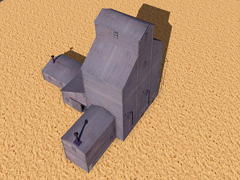 Grain loading, made of wood, with grain elevator with open entrance doors, old west style. Dimensions: 24m high, 26m wide and 30m long. It has 2 chimneys with smoke. It is not interactive or functional, it has no night mode. Version O14. In this version the wood textures are blue-gray