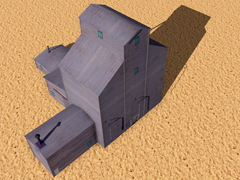 Grain loading, made of wood, with grain elevator with closed entrance doors, old west style. Dimensions: 24m high, 26m wide and 30m long. It has 2 chimneys with smoke. It is not interactive or functional, it has no night mode. Version C14. In this version the wood textures are blue-gray