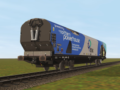 The fleet of 225 IIA-D biomass wagons were produced for the sole purpose of transporting imported biomass pellets from docks to the UK's largest power station, Drax, in North Yorkshire. These huge hopper wagons were volumetrically the largest on the network when first built. Biomass must be kept dry during transport and is much lighter than other materials such as coal, so more can be carried per wagon - the wagons were purpose built to carry biomass in the conditions required. The revolutionary design integrates four hoppers, two centrally and two outside each bogie. The IIA-Ds body profile is also designed to make maximum usage of the UK loading gauge. These colourful vehicles have been vinyled-up in various advertising liveries for the Drax Power company and can be seen in operation between Liverpool, Immingham, Tyne, Redcar, Hull and the Drax Power station.