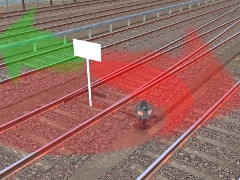 Note that this asset cannot by itself switch the direction of a junction. An invisible switch lever must be added to the junction. An association between the invisible lever and the switch-direction indicator is established through a naming convention. If the invisible lever is named 'HR_16', then the indicator must be named the same way with the suffix '_i' appended: 'HR_16_i'.