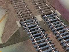 A bridge abutment double track of 12ft separation (standard for NSWGR track of mid 20th century). The abutment has a brick face and 2 adjacent concrete receptacles for box girders. Use 3m of no-ballast track for approach tracks at each end.