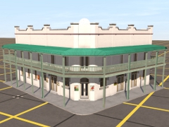 A late-Victorian-era double-storey hotel located on a street corner in a NSW country town. Based on 'The Railway Hotel' in Murrurundi. The beer advertising on the ground-floor walls is typical of the 1950s and 1960s.