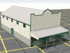 An awning, 14ft deep, covers both shopfront windows. Shop names can be added to the awning bargeboard in Surveyor mode using each asset instance's Properties Editor.