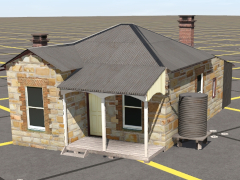 A scribed-stone house with an unpainted corrugated-iron roof and decorative window borders.