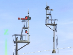 Each signal was controlled by a nearby relay hut ('NSWGR automatic signal relay hut', kuid:368725:20070) in which track-circuit detections were converted into signal-motor instructions to set the semaphore position. The spectacle arm of the upper light was driven from a jointed rod that connected it to the semaphore. The complex movement of this rod is beyond my skill to animate, so it has been omitted from the model.