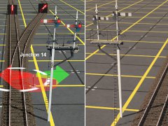 For correct automatic operation the signal must be used with directional feathers to uniquely identify the 2 possible paths indicated by each semaphore. Use <kuid2:60850:23901:4> 'Sig T Feather Straight' to mark the path of the Main semaphore; and <kuid2:60850:23921:4> 'Sig T Feather Right 1 (pos 4)' to mark the path of the Loop semaphore.