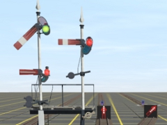 For correct automatic operation the signal must be used with directional feathers to uniquely identify the 2 possible paths indicated by each semaphore. Use <kuid2:60850:23901:4> 'Sig T Feather Straight' to mark the path of the Main semaphore; and <kuid2:60850:23921:4> 'Sig T Feather Right 1 (pos 4)' to mark the path of the Loop or Branch semaphore.