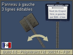 Old french road sign <Historical monuments and sites> with arrow to the left. The text can be edited by script in surveyor on three lines of 16 characters (parameter option of the object <?>) and tiltable (rotation option + Shift key pressed).