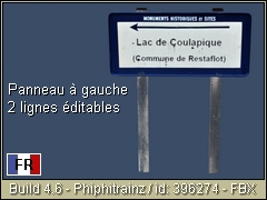 Old french road sign <Historical monuments and sites> 130 x 60 cm on 2 poles with arrow to the left. The text can be edited by script in surveyor on two lines (parameter option of the object <?>).