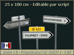 French directional road sign on the right 100x25 cm type D21 (1 line) for departmental road. The destination, with or without mileage as well as the addition of the little road sign with its number can be personalized (eg: NAME-CITY or NAME-CITY 7.5 / sign: D 123). FBX/PBR Phiphitrainz 2022 3d object.
