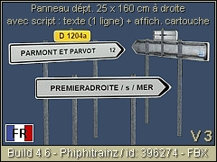 French directional road sign on the right 160x25 cm type D21 (1 line) for departmental road. The destination, with or without mileage as well as the addition of the little road sign with its number can be personalized (eg: NAME-CITY or NAME-CITY 7.5 / sign: D 123). VERSION 3 : NEW CORRECTED PBR TEXTURE - FBX/PBR Phiphitrainz 2023 3d object.