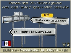 French directional road sign on the left 160x25 cm type D21 (1 line) for departmental road. The destination, with or without mileage as well as the addition of the little road sign with its number can be personalized (eg: NAME-CITY or 7.5 NAME-CITY / sign: D 123). VERSION 3 : NEW CORRECTED PBR TEXTURE - FBX/PBR Phiphitrainz 2023 3d object.