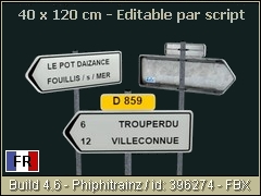 French directional road sign on the left 120x40 cm type D21 (2 lines) for departmental road. Destinations, with or without mileage as well as the addition of the little road sign with its number can be personalized (eg: NAME-CITY or 7.5 NAME-CITY / sign: D 123). FBX/PBR Phiphitrainz 2022 3d object.